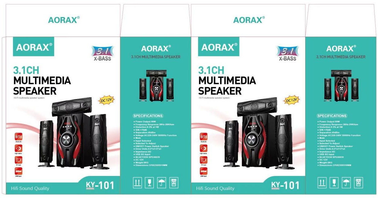 Power Output:60w Frequency Response:38Hz- 20KHzm Distortion:0.3% at 1W S/N:>70dB Separation:45dBm Voltage:AC220-240V 50/60HzFunction Mute Input Selected Selected To Adjust ON/OFF Power Switch Speaker Drive Units:6.5"x1+3"x3 Impedance:4Q USB SD Input BLUETOOH SPEAKER DC-12V Weight:6KG Dimensions:370X230X510MM |