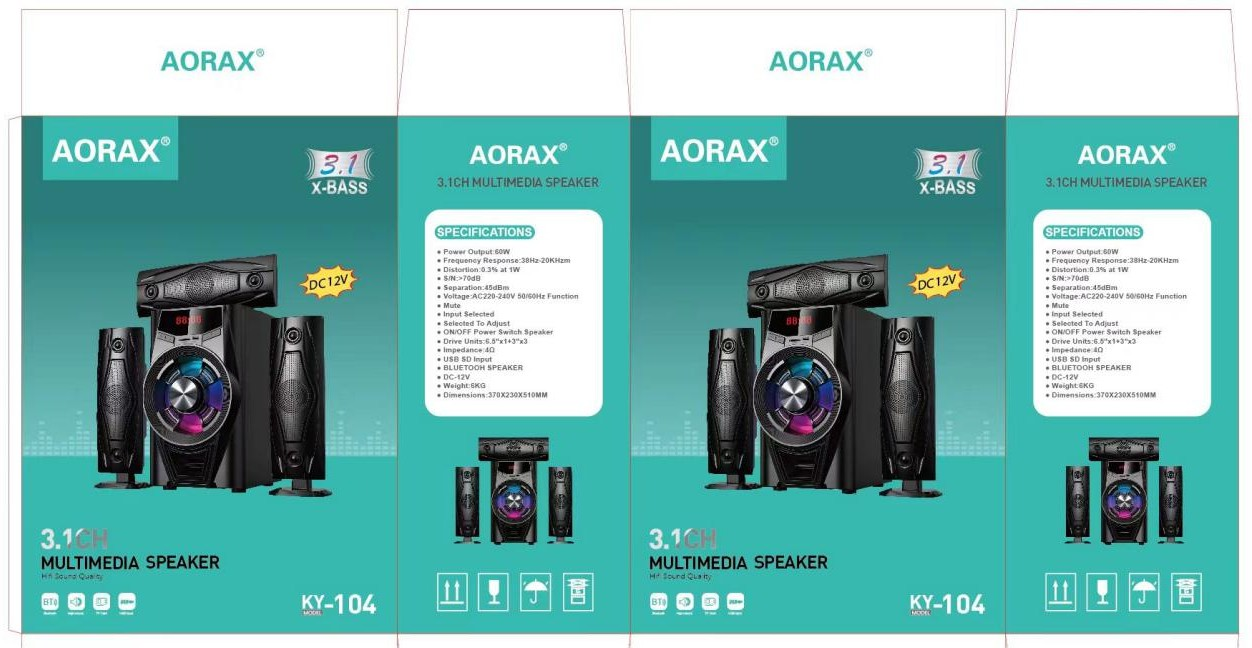 Power Output:60w Frequency Response:38Hz- 20KHzm Distortion:0.3% at 1W S/N:>70dB Separation:45dBm Voltage:AC220-240V 50/60HzFunction Mute Input Selected Selected To Adjust ON/OFF Power Switch Speaker Drive Units:6.5"x1+3"x3 Impedance:4Q USB SD Input BLUETOOH SPEAKER DC-12V Weight:6KG Dimensions:370X230X510MM |